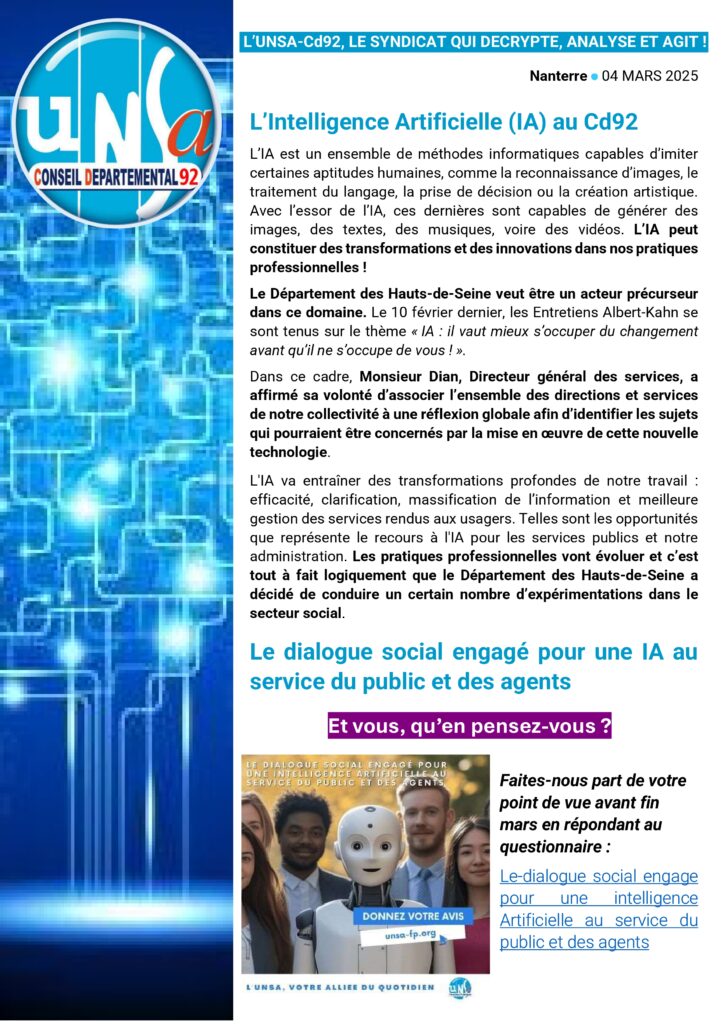 L’Intelligence Artificielle (IA) au Cd92 UNSA'ctualité / UNSA_CD92 L’Intelligence Artificielle (IA) au Cd92 Lire la suite »