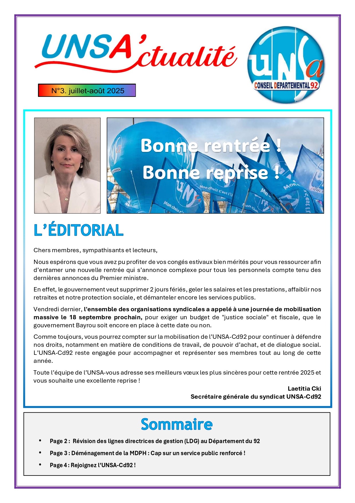 UNSA’ctualité N°3 juillet-août 2025Par UNSA_CD92 / 31 août 2025 Cliquez ici pour télécharger Publications similaires : UNSA’ctualité N°1 mars-avril 2025 UNSA’ctualité N°2 mai-juin 2025 UNSA’ctualité N°4 septembre-octobre 2025 UNSA’ctualité N°5 novembre-décembre 2025